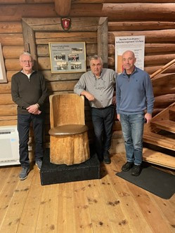 Ved ankomst på Telthuset ble vi mottatt av styreformann Tor Borgan, til høyre på bilde, daglig driftsleder Annar Dahlen, til venstre på bilde og styremedlem Asgeir Tromsdal, i midten på bilde. De står ved Konge stolen.
