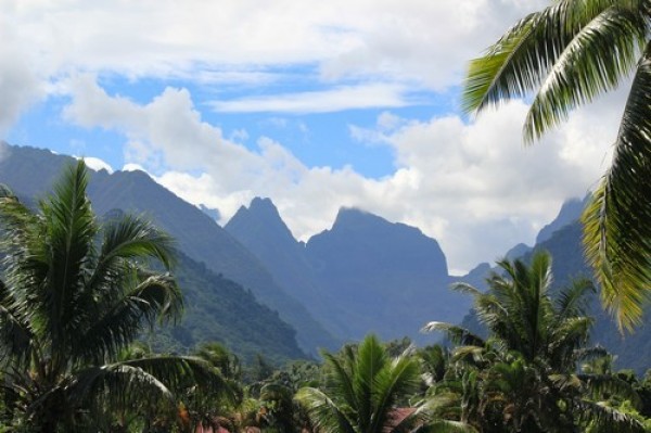 På noen av øyene er det høye fjell og frodig vegetasjon som dette bildet viserLandskap på Tahiti, Fransk Polynesia.
